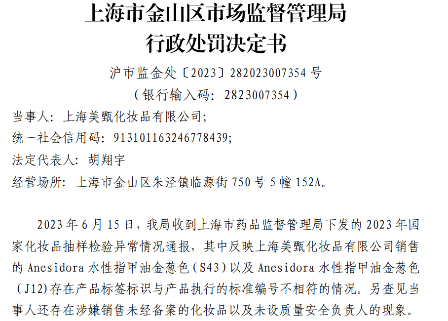 据行政处罚决定书披露,上海市金山区市场监督管理局收到上海市药品监督管理局下发的2023年国家化妆品抽样检验异常情况通报,其中反映上海美甄销售的指甲油存在产品标签标识与产品执行的标准编号不相符的情况,于是前往该公司调查。