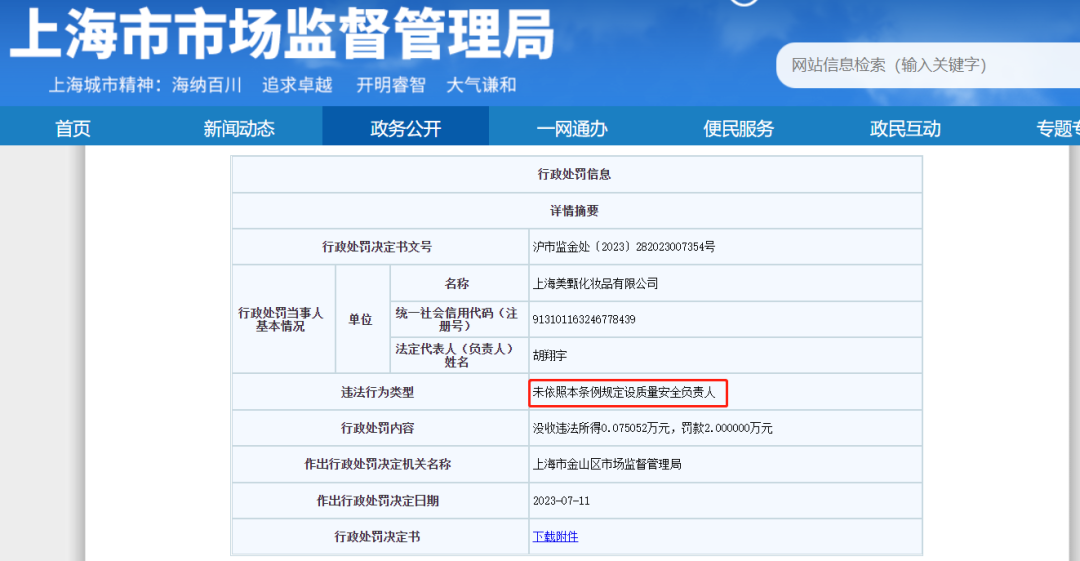 在调查过程中,上海市金山区市场监督管理局还发现,上海美甄原质量安全负责人谭某已于2022年10月离职,截至2023年6月28日案发,上海美甄作为化妆品注册人、备案人实际并未设质量安全负责人。也就是说,上述违法事实发生于质量安全负责人这一岗位空缺期。
